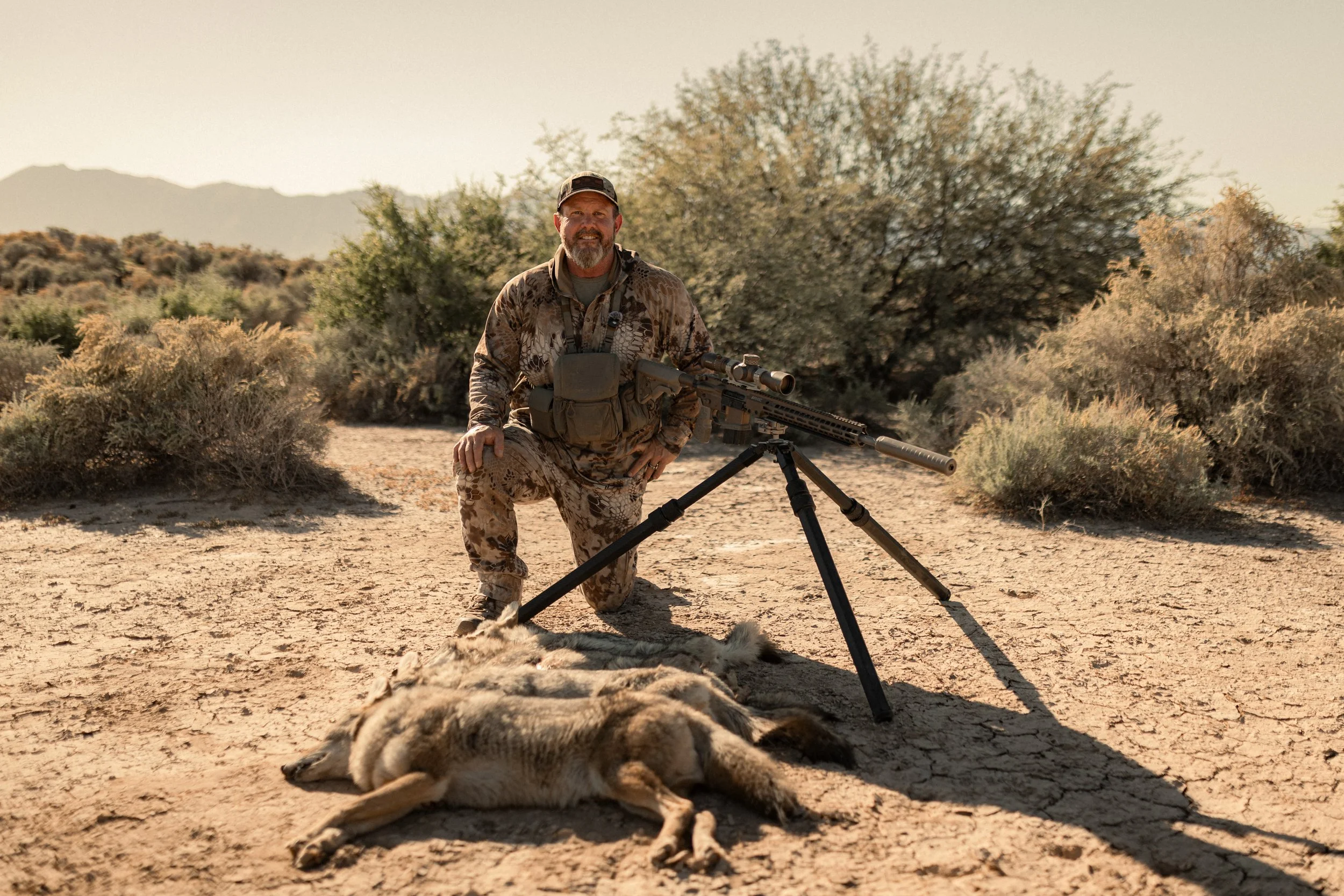 Our setup has evolved over time, but we primarily use AR platforms and we run suppressors to save our ears and call in multiples. We run all our rifles off two vets tripods that utilize the arca system. We use Arken optics on our hunting rifles because the glass quality is incredible and their prices don't break the bank. We also utilize Sceery hand calls and Lucky Duck electronic calls to bring coyotes nice and close. We use Kryptek Highlander camo to stay concealed in the AZ desert.